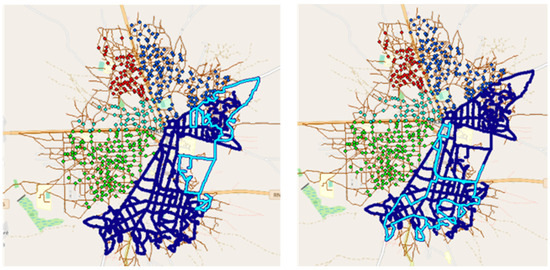 The collection vehicles will load the waste at the collection points (CPs), which must be located on the main streets, as the access to the courtyards is not possible. At these CPs, the staff of the waste collection system will load the waste onto trucks. First, 813 possible collection points were located every 150 m along the main streets of the town, near the courtyards and near the shops (Figure 3).