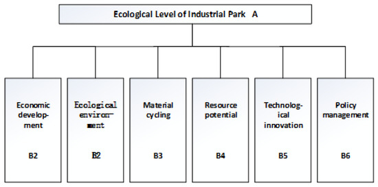 In 2015, China’s Environmental Protection Bureau promulgated newly revised standards for national eco-industrial demonstration parks. The standards stipulated evaluation indicators for assessing national eco-industrial parks and divided them into five dimensions, including economic development, industrial symbiosis, resource conservation, environmental protection, and information disclosure [16,17]. For this study, based on the national eco-industrial demonstration park standard, relevant experts were organized to conduct a group assessment and screening. The study also redefined the criteria layer to determine the indicators of economic development, ecological environment, material cycling, and resource potential. In addition, Zhai (2016) proposed a comprehensive effectiveness evaluation index system for ecological industrial parks. They used two dimensions to determine the technological innovation and policy management indicators. Finally, based on the primary selection, an initial set of 39 indexes were determined. The 39 indexes were further classified into 6 dimensions according to the category. Figure 2 shows the framework of the six-dimensional index system. This established a new evaluation index system to specifically assess ecological industrial parks [18], as shown in Table 1.
