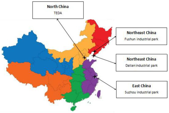 Data released by the Ministry of Ecology and Environment indicate that 51 industrial parks nationwide had been named as national eco-industrial demonstration parks as of June 2019. Nine of these were located in Jiangsu. There are nearly 7000 industrial parks and concentration areas. For this study, four representative industrial parks were selected for ecological level evaluation, based on park characteristics, operational mode, and areas. The parks selected for evaluation included the Suzhou industrial park, the Tianjin economic and technological development zone, the Dalian economic and technological development zone, and the Fushun mining group. For the rest of this paper, these are referred to as Suzhou industrial park (SZIP), TEDA, Dalian industrial park (DLIP), and Fushun industrial park (FSIP). Figure 3 and Table 3 show the geographical distribution and basic information for each park.