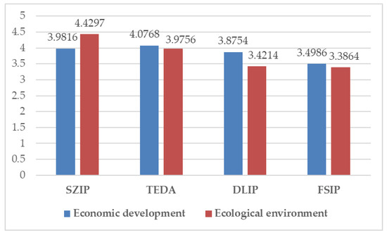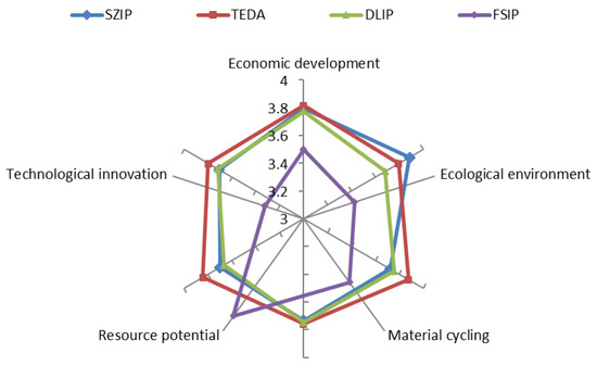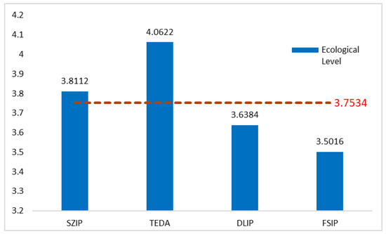 Figure 4 indicates that the ecological level of the four industrial parks could be ranked as follows: TEDA (4.0622) > SZIP (3.8112) > DLIP (3.6384) > FSIP (3.5016). Of these, the ecological level of the TEDA and SZIP was higher than the average level (3.7534). According to the score criteria set above, the ecological level of TEDA was “very good,” and the ecological level of the other three industrial parks was “good.”