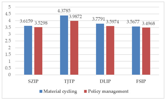Table 4 shows that the weight of policy management in the ecological evaluation index system of the industrial parks is the largest (0.2849). It indicates that policy management has a greater impact on the ecological level of industrial park. Figure 5 and Figure 7 show that the evaluation value of the policy management of TEDA is the highest. This suggests that the government of Tianjin and park management committee have achieved significant advances in policy guidance, regulation, oversight and management of the park. For example, in July 2018, the Tianjin Municipal Government began to comprehensively promote the governance of industrial parks to speed up industrial layout optimization and ecological civilization construction. The government is expected to integrate 35 industrial parks and revoke 10 industrial parks, and plans to revoke 116 industrial parks within three years. This is intended to create innovative, open and ecological industrial parks. In addition, TEDA assigns great importance to the influence of employees and public forces on the ecological construction of the park. For example, the park has established a waste minimization club, and regularly organizes enterprises to carry out waste recycling, cleaner production training, and exchange activities. Non-profit environmental protection organizations, such as the Friends Of Green China Tianjin, and Tianjin Binhai Environmental Advisory Service Center, have carried out ecological management marking activities, which oversees and publicizes the ecological construction of the park, and alleviate environmental contradictions among private enterprises.