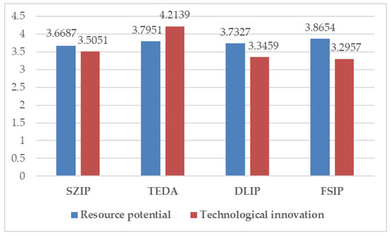 The resource potential and technological innovation ability of the industrial park somewhat explain the park’s ecological development potential. First, from the perspective of resource potential in the parks, Figure 5 and Figure 8 show that the four industrial parks differ little with respect to evaluation values and were all at a “good” level. The evaluation value of the resource potential of FSIP was slightly higher compared to the other three industrial parks. Fushun is an important raw material industrial base in China. FSIP has made full use of the resources available from the old industrial base and has attracted many high-level projects at home and abroad. In 2017, it had 74 million tons of coal reserves and 600 million tons of oil shale reserves, with a mining life of 60 years. In addition, Fushun’s renewable resources industrial park has achieved the comprehensive utilization of bulk industrial solid waste, which is an important direction towards industrial transformation and upgrades.