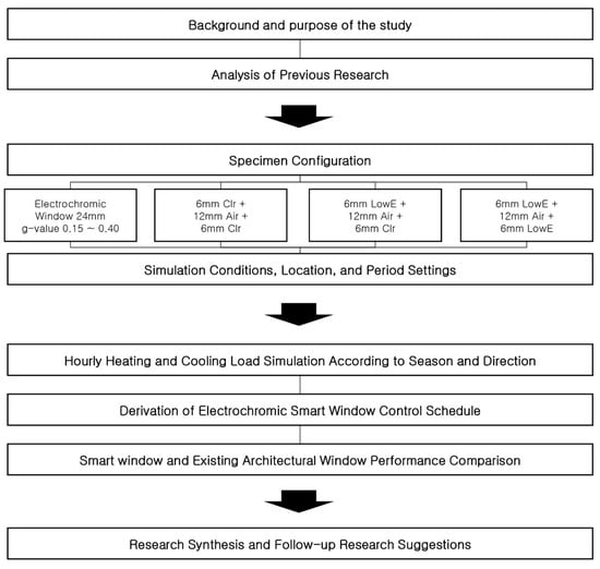 This study aims to analyze the operation schedule considering the cooling and heating energy performance of electrochromic smart windows and the energy savings rate compared to existing architectural windows. Therefore, to compare the cooling and heating energy performance, groups of electrochromic smart windows and existing architectural windows with various g-values and U-values were established. Analysis was done through simulations. Based on previous research, an EnergyPlus engine was used to derive the energy consumption over time. In addition, Rhino Grasshopper’s Ladybug Plug-in was applied to efficiently organize data on the cooling and heating loads of each control group. The Ladybug plug-in, which can apply the EnergyPlus engine to the Rhino Grasshopper model, is capable of extracting and organizing the values of the required data. After setting up the simulation program, the simulation area and analysis point were set, and a virtual target building was created. For the southern, eastern and western sides, the cooling energy and heating energy consumption of the control groups were derived over time. Based on this data, a g-value schedule was created for optimal operation of electrochromic smart windows, and the total amount of energy consumed was calculated. The energy savings rate of the smart windows compared to the existing windows was compared through the calculated values. The flow of research is shown in Figure 1.