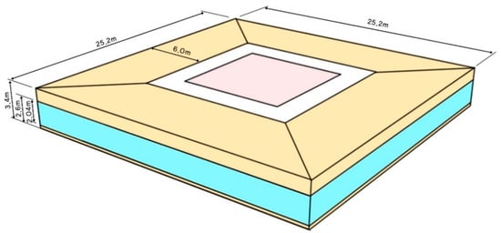 In this study, the area of the core was calculated as 81 m2; it was a 9 × 9 m2 square. The span of the office pillar can be calculated by the parking space, and it was calculated as 8.1 m considering the three sides of the parking space and the size of the pillar (2.5 × 3 + 0.6 m). The width of the office space was 6 m, which was determined by subtracting the 2.1 m of corridor space from the 8.1 m column spacing span. The height was set to 3.4 m, and the ceiling height was set to 2.6 m. The window area ratio was 60%. A schematic illustration of the created office is shown in Figure 2.