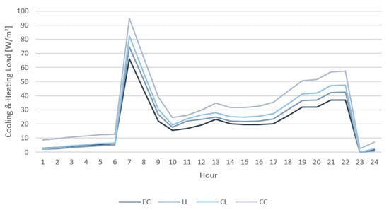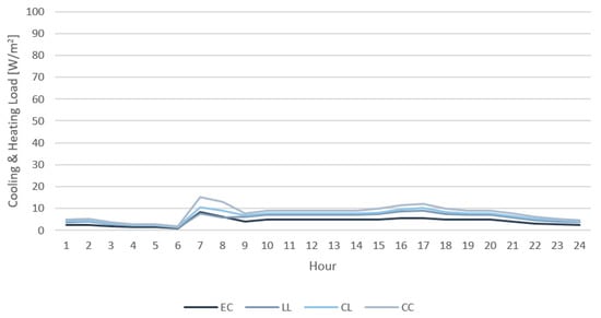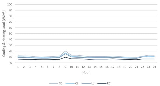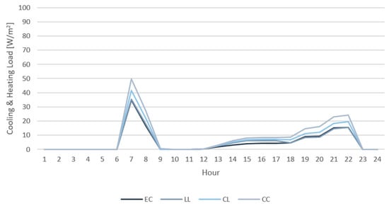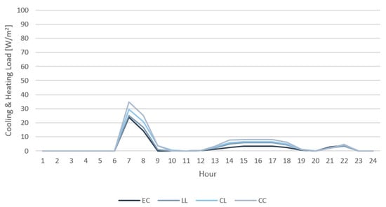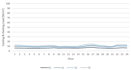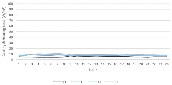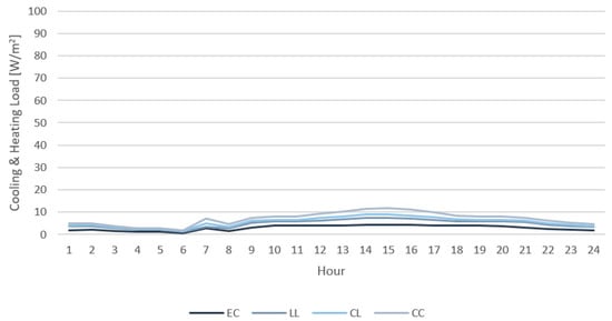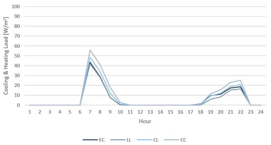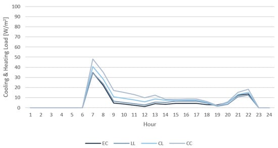 When the schedule was applied, the minimum value of the cooling and heating load was 68.788 W/m2, while those of the existing building windows CC, CL, and LL were 166.684, 132.558, and 112.468 W/m2. Thus, we found that the cooling and heating loads could be reduced by 38.8–58.7% when smart windows were used instead of control windows on the autumnal equinox on the south side. A graph comparing the energy load of the electrochromic window applied with the schedule to those of the control windows is shown in Figure 5.