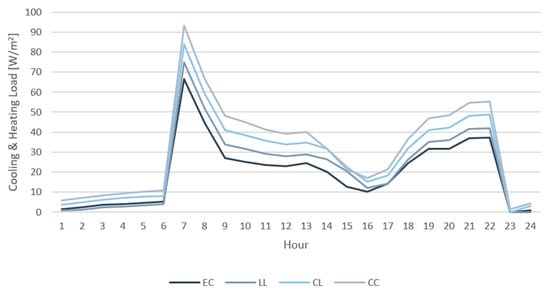 When the schedule was applied, the minimum value of the cooling and heating load was calculated as 121.853 W/m2, while those of the existing building windows CC, CL, and LL were 196.977, 159.613, and 129.602 W/m2. Thus, the cooling and heating loads could be reduced by 6.0% to 38.1% when smart windows were used rather than control windows based on data from the eastern equinox. A graph comparing the energy load of the electrochromic window applied with the schedule to those of the control windows is shown in Figure 7.