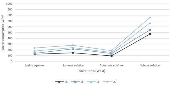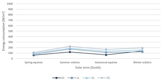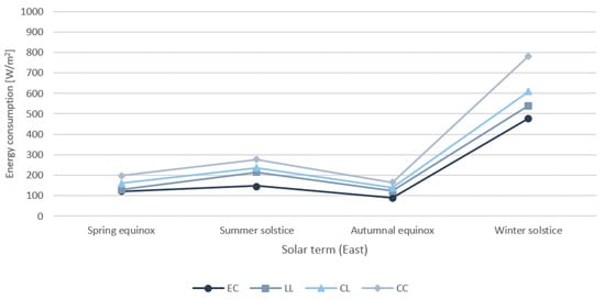 The sum of the cooling and heating energy loads was derived for all four seasons. For the south side, energy savings of 20.3% to 45.0% are possible for each sunny day in all four seasons, making summer the season in which the greatest increase in energy efficiency is possible. Energy savings of 17.1–41.2% on the east side and 18.6–42.2% on the west side are possible. The energy load for each solar term is summarized in Figure 15, Figure 16 and Figure 17.