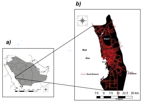 A remarkable expansion in Jeddah’s road infrastructure was witnessed over the past few decades. The total length of roads was only 101 km in 1964, which has expanded nearly 10-fold after 50 years. A major part of the current road network was built in the city during the 1970s, which is known as the golden age for roads [32]. The road network in Jeddah was designed all the way through a linear grid pattern because the city was contracted between the red sea and mountains from the two sides [33,34].