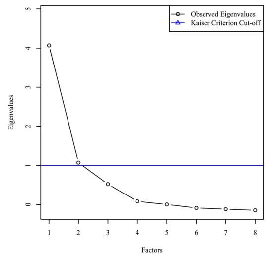 We use up a common practice of Kaiser’s eigenvalue >1 to keep the factors [53,54] and extracted 2 factors with had an eigenvalue more than one. Both factors together explained 60.16% of total variance in the data, where Factor 1 with eigenvalue 2.57 described 32.15% variance, and Factor 2 with eigenvalue 2.24 explained the remaining 28.01% of variance (Table 3). A scree plot (Figure 2) illustrates the number of significant factors with the Kaiser criterion.