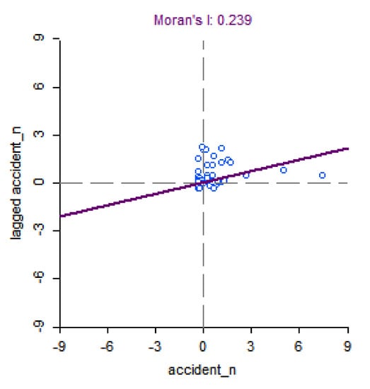 Moran’s, I scatter plot for the pedestrian fatalities in Jeddah.