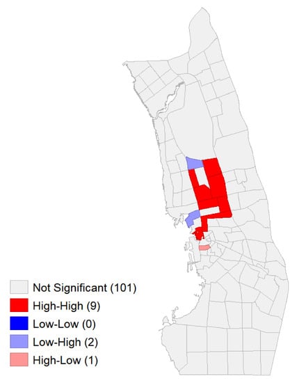 In addition, we used LISA to map the location of spatial clusters and outliers [58]. LISA complements the shortcomings of global Moran’s I.