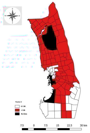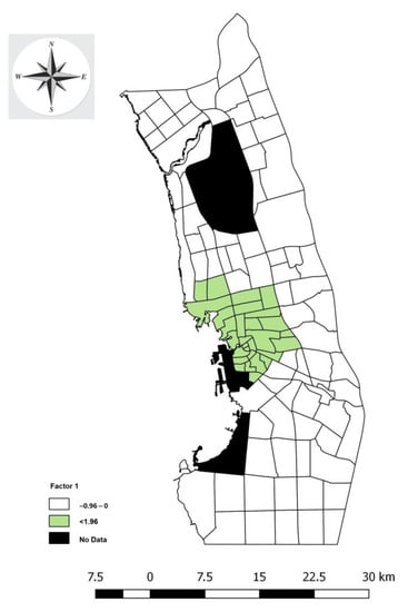 The “land-use” factor is not significant for the global regression model having a negative sign, and it is significant for 26.36% of districts in GWR, based on local t-scores (Figure 6). The coefficient for this factor is moderate and self-explanatory; higher commercial, residential, school, and hospital density makes drivers and pedestrians cautious, leading to less pedestrian fatalities. However, the contribution of this factor in the global model is minimal, which is clear by the lower estimate value of −0.200133 (Table 7). Additionally, the old city center (Al-Balad) has a higher commercial and residential density; however, pedestrian fatalities have been negligible in the district because of driving restrictions during peak business hours.