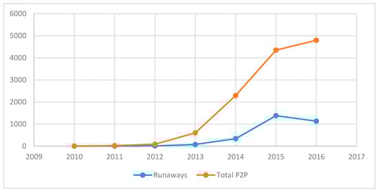 The first P2P-lending platform, Zopa, was launched in Europe in 2005 [38]. In the US, Prosper.com was the first in 2006. However, it was during the last global financial-market shock in 2007, in which formal financial institutions withdrew from the consumer microcredit market, and advances in internet payment technologies, that P2P-lending platforms experienced their greatest growth, especially in China. China’s first P2P-lending platform, Paipaidai, was founded in 2007 [39]. The rapid adoption of internet-based payment transactions and online credit scoring (https://globalfindex.worldbank.org/) allowed these platforms to proliferate at a rate that took authorities by surprise [37]. From the inception of the first platform, P2P firms grew by an average of 1000 platforms and 100 billion RMB transactions a month, making it the world’s leader in peer-to-peer lending. The P2P-lending market continued to grow around the world, perhaps because of the Great Recession of 2007 [37,40].