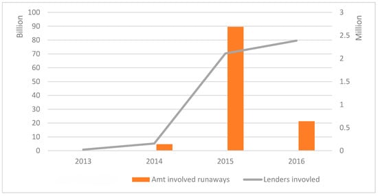 Figure 2 shows the amount of money and the number of lenders affected in the runaways (Figure 2). The amount of money absconded surges in 2015 to nearly 90 billion RMB (approximately 14.52 billion USD using the 2015 average exchange rate), affecting more than 2 million lenders. The surge was driven by one runaway called “Ezubao”, which involved 65 billion RMB. Given how social media affects everything from political engagement [76] to stock price convergence [77], the Ezubao event had such profound social media coverage that the regulators finally stepped in to enact stricter regulations and enforcement in P2P lending, effectively wiping out meaningful differences between provinces in 2016 and beyond.