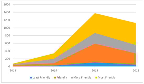 In China, business friendliness is simply a measure of the degree to which local governments competed for inbound investment capital and business establishment into their regions. As such, a more business-friendly province is said to have smaller government [2], fewer administrative barriers [21,22,23,24], broader access to financial capital [26], more developed factor market, and better infrastructure [65]. Factor markets and infrastructure development tended to vary more across the provinces than institutional development since local governments, with few exceptions, took their cue from the central government [65]. Provinces that were more business friendly were found to report higher levels of business-innovation activity and attracted concomitant human resources [28], faster-growing industries [29], and better enterprise performance [19,23].