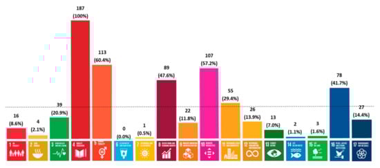 In the 187 curricular units, as we can see in Figure 3, beyond Goal 4, Goal 5—Gender Equality (64%) and Goal 10—Reduced Inequalities (57.2%) were the most identified. This was followed by Goal 8—Decent Work and Economic Growth (47.6%), Goal 16—Peace, Justice and Strong Institutions (41.7%), Goal 11—Sustainable Cities and Communities (29.4%) and Goal 3—Good Health and Well-Being (20.9%). All other SDGs were less identified (percentages below 15%), except for Goal 6—Clean Water and Sanitation, which was not identified in any courses.
