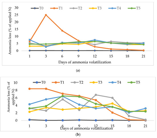 The insignificant difference in soil temperature and pH of all troughs (T0, T1, T2, T3, T4, and T5) (Figure 6 and Figure 7) could not provide much information on the effects of soil water temperature and pH on NH3 volatilization in this study, although it is widely known that temperature and pH have important effects on NH3 volatilization in soil fertilized with N fertilizers [48]. According to Cai et al. [49], the rate of NH3 volatilization was greater during the summer because N fertilizers are applied in high temperature. In our previous studies on using sago wastewater to mitigate NH3 volatilization, when temperature increased up to 45 °C, the amount of NH3 was also increased due to the temperature effects on NH4+ absorption, NH4 + and NH3 equilibrium, and conversion of NH4 + into NH3, which, thus, increased NH3 diffusion rate [50].