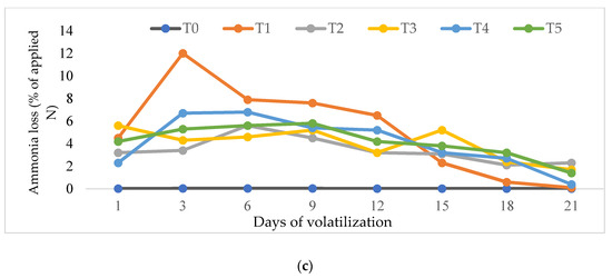 The soil without any fertilization (T0) did not emit NH3 throughout the incubation period regardless of urea application times (Figure 4a–c). Irrespective of application time (28 DAP, 50 DAP, and 70 DAP), similar duration of NH3 emission from the trough with urea alone (T1) occurred for 21 days of the incubation study compared with the troughs with the combined urea and RH compost (T2, T3, T4, and T5) (Figure 4a–c). Ammonia was emitted from day 1 to day 6 from the troughs with urea alone (T1) compared with the troughs with urea and RH compost at different rates (T2, T3, T4, and T5) for 28 DAP, 50 DAP, and 70 DAP, respectively (Figure 4a–c). It must be stressed that T1 and T2 consist of similar amounts of urea which were applied at 100% recommendation, however, higher emission of NH3 occurred with T1 (urea only) compared with T2, although urea was also applied at 100% (similar to T1) but amended with 20 g of RH compost. The highest amount of the daily NH3 loss in most of the troughs occurred during the first application (28 DAP) of urea at different rates than during the second (50 DAP) and third (70 DAP) applications (Figure 4a–c). The amounts of daily NH3 loss were lower in the troughs with co-application of urea and RH compost (T2, T3, T4, and T5) compared with troughs with urea only (T1) regardless of urea application times (28, 50, and 70 DAP) (Figure 4a–c).