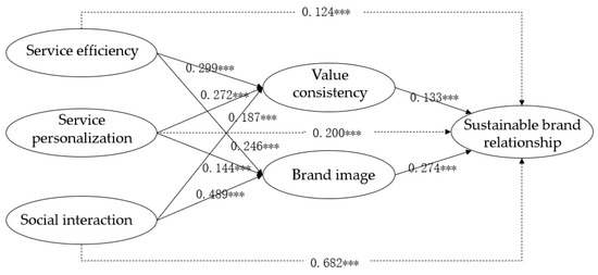 This study uses AMOS21.0 and SPSS 25.0 to test Hypotheses 1–4, and the fitting coefficients of the basic model are shown in Figure 3. It can be seen from Figure 3 that in the measurement dimensions of the value of the smart community service function, service efficiency (β = 0.124, p < 0.001), personalization (β = 0.200, p < 0.001), and social interaction (β = 0.682, p < 0.001) (these numbers indicate the direct effect of “X to Y” from regression step 2 to show the hypothesis verification results clearly, using dotted lines in Figure 3) all significantly positively related to sustainable brand relationships; service efficiency (β = 0.299/0.246, p < 0.001), personalization (β = 0.272/0.144, p < 0.001), social interaction (β = 0.187/0.489, p < 0.001) functions have significant positive impacts on the value consistency and brand image in brand emotional cognition aspect; the value consistency (β = 0.133, p < 0.001) and brand image (β = 0.274, p < 0.001) have a significant positive impact on sustainable brand relationship, that is, H1a–1c, H2a–2c, H3a–3c, and H4a–4b have all been verified.