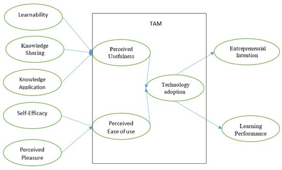 The technology acceptance model (TAM) was used for this study, which is derived from the theory of reasoned action by Ajzen and M. Fishbein [4], as it illustrates and explains the behavior of the user after the adoption of new technology. TAM has two primary exogenous constructs: perceived ease of use and perceived usefulness. Researchers have applied TAM in their studies to check the entrepreneurial intention of consumers toward the use of some new technology [35,36]. Chen [37], Sukkar and Hasan [38], Aldás- Manzano, Lassala-Navarré, Ruiz-Mafé, and Sanz-Blas [8] examined TAM and its relevance in measuring the students’ intention toward technology adoption. They also proposed modifications and extensions in the model. In this study, we extended the TAM model by adding the predicted variables, which improved the student learning performance by adopting business simulation games. These predicted variables included knowledge management (knowledge sharing, learnability, and knowledge application) self-efficacy, and perceived enjoyment. However, after reviewing the literature, few studies were found that examined and investigated the adoption of business simulation games for entrepreneurial learning using this modified TAM. Arpaci [19] extended the TAM by employing knowledge management practice constructs to measure the student’s intention toward technology adoption. Similarly, TAM was extended and modified to measure the adoption of learning management system in accessing online study material [39,40]. Zulfiqar, Sarwar, Aziz, Chandia, and Khan [41] modified TAM by adding perceived pleasure to measure the adoption of business simulation games and intention of the students’ entrepreneurship. Sanchez and Hueros [42] extended TAM to measure student technology adoption behavior by employing self-efficacy and technical support variables. Given the extensive literature on perceived usefulness and its role in developing entrepreneurial intention toward using a particular technology, like game adoption, which we took in our study, we examined the relationship between knowledge sharing, learnability, self-efficacy, and fun to play and explored these by linking it with the TAM model and identifying the effect of these variables on business simulation game adoption and the learning performance of students [41]. This relationship can be seen in Figure 1.