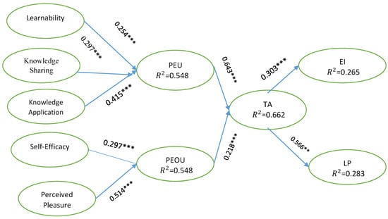 Graphical representation of the path coefficient of business simulation game adoption. PU (perceived usefulness), PEOU (perceived ease of use), TA (technology adoption), EI (entrepreneurial intention), LP (learning performance). In the values, ***, **, * indicate significance at the 1%, 5%, and 10% significance levels, respectively.