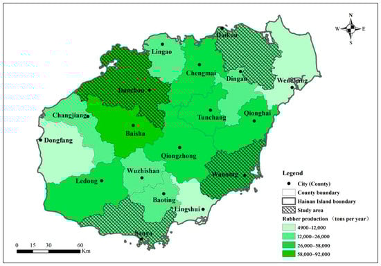 The data used in the study came from a household survey conducted in Hainan Province, China, in July 2019. Hainan is located in the southernmost part of China and is its most crucial rubber tree production base. In 2018, the rubber tree planting area in Hainan was 528,000 ha, accounting for 45.7% of China’s total rubber tree planting area [1,59]. Since the 1950s, large-scale rubber tree planting has replaced the virgin tropical rainforest on Hainan Island and has caused severe environmental problems [60,61,62]. We collected data via stratified random sampling. First, we randomly selected four cities: Haikou (northern Hainan Island), Sanya (southern), Danzhou (central), and Wanning (southern) (for details, see the study area in Figure 1).
