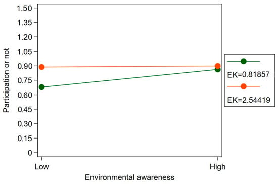 To more clearly and intuitively illustrate the moderating effect in Hurdle I, we drew a diagram, as shown in Figure 3. When residents’ environmental knowledge level is low, it is more likely that environmental knowledge will have a more substantial moderating effect on the correlation between residents’ environmental awareness and their wish to PN (with a higher slope). In contrast, when their environmental knowledge level is high, its moderating effect will be smaller (with a smaller slope). The causes of such results are worth discussion. Specifically, environmental awareness and environmental knowledge can directly affect residents’ willingness to participate in ecological restoration actions. However, participation decisions based on environmental awareness tend to be more subjective, while those based on environmental knowledge tend to be more objective. Residents with high environmental knowledge levels (i.e., those who know more about the ecological restoration programs) are more inclined to base their decisions on their environmental knowledge than to base their decisions on their subjective environmental awareness [48,53].
