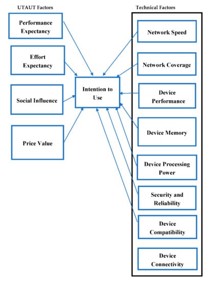 These challenges are due to different technical standards between countries []. Some of these challenges arise, for example, in African countries where the technological infrastructure is inadequate []. Although many studies have measured the technology acceptance of recipients, there remain deficiencies in those studies in the context of Arab countries, which is a limiting factor regarding cultural values and the extent of the impact on technology acceptance in these countries []. Therefore, given these challenges and the limited investigation of the technical factors, we formulated our following hypotheses using the proposed model adopted from UTAUT. The unified theory of acceptance and use of technology (UTAUT) with the TAM model is considered one of the most cited models in the area of using technology []. As well as, UTAUT was found to outperform many of the previous theories []. As mentioned before, in a recent review conducted by some researchers to study technology and acceptances models in the last decade, UTAUT was found the most used model []; therefore, UTAUT model was relied upon because it is the latest.