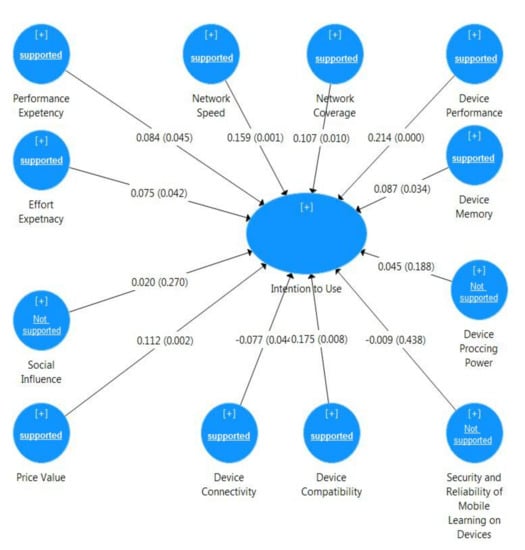 Despite the many studies that have been conducted on mobile learning, more research is still needed to investigate the attitude of students towards mobile learning []. Conducting more research in this domain will help researchers gain a better understanding of how to exploit this smart technology in education []. Despite the several benefits of mobile devices, they still have limitations that affect students’ acceptance of this new technology []. This aspect has motivated researchers to address these limitations. For instance, applying this type of technology in education will help learners achieve the optimal use of such devices to enhance their knowledge and learning ability []. Several universities across the world have integrated m-learning into their settings, but they still face several problems that prevent students from exploiting mobile learning systems in an optimal way []. These obstacles may be related to technical and non-technical aspects, such as device capability, network coverage, facilitating conditions, social influence, and others []. In addition, acceptance of mobile learning among students is considered an important step to ensuring the success of mobile learning implementation []. However, the slow adoption of m-learning has been considered a technical issue rather than an educational problem []. Therefore, there is a need to identify key technical factors that could help motivate students to use mobile learning systems in their education [].