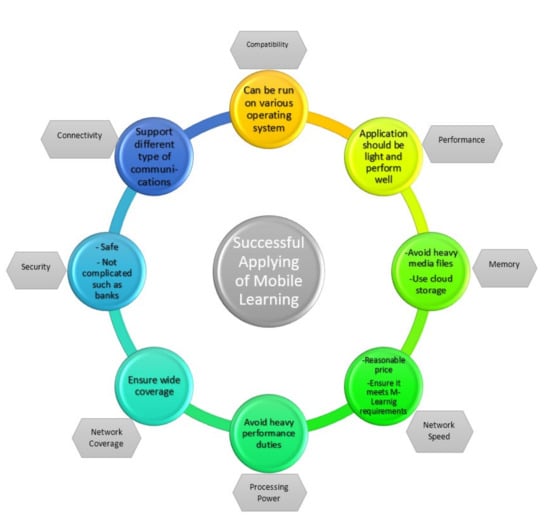 Given the advancements of smart devices, m-learning technology is still considered as a secondary method of learning: The role of the teacher still forms the basis of learning due to several social and technical considerations []. Despite this, results from previous studies have shown that many students still have the desire to use mobile devices since it enhances the speed of communication with their teachers and colleagues more than the traditional methods currently available []. Moreover, m-learning makes the education process more acceptable to students, especially among the younger generation who are more likely to pursue and use new technology []. Indeed, m-learning allows students to learn independently without the need for teachers, which increases their level of interaction with other users and information []; it is also not necessary to carry out this operation in the same place, but anywhere and at any time []. Interestingly, university students tend to use their mobile phones to communicate with each other without having noticeable problems in the learning process [].