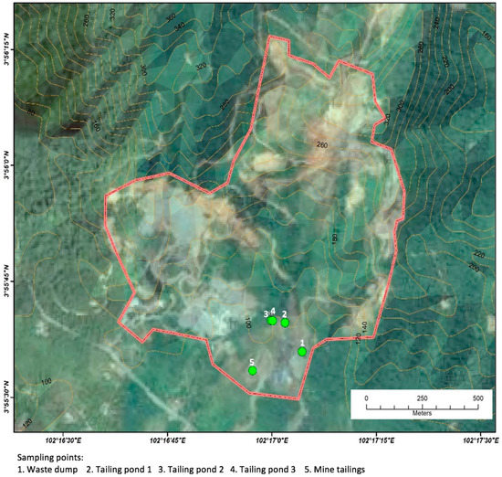Malaysia undertakes a variety of mining activities for materials such as iron, gold, tin, bauxite, copper, manganese, silver, and titanium (metallic minerals); gypsum (CaSO4·2H2O), feldspar (KAlSi3O8-NaAlSi3O8-CaAl2Si2O8), kaolin (Al2Si2O5(OH)4), limestone (CaCO3), mica, sand and gravel, clays and silica sand (non-metallic minerals); and coal [1]. Regardless of the decline in production of the mined minerals, the mining sector remains one of the most important sectors in fulfilling demand and maintaining the Malaysian economy [2,3]. In order to sustain a constant supply of minerals to the global marketplace, Malaysia’s government has continuously encouraged the exploration of minerals throughout the country. However, the excessive mining of minerals has not only provided Malaysia with economic growth but has also created some environmental problems mainly associated with the mining waste. The mining wastes can be defined as materials with no ore minerals, which are discarded from ore processing as they are lacking in economic importance and are valueless as compared to the ore, and are normally disposed in the form of stockpiles. This situation may bring harm to human health as well as potential environmental damage as the stockpiles that are exposed to weathering have a high potential to generate mine tailings which may contain high levels of toxic substances [4] For instance, sulfate and some trace elements commonly flow into tailing drainages thus initiating acid mine drainage problems which can be highly acidic [5,6]. As the acidic mine tailing flows into the water body, it will create further environmental problems.
