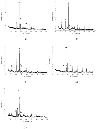 XRD diffractograms of samples from five different sampling sites: (a) tailing pond 1; (b) tailing pond 2; (c) tailing pond 3; (d) mine tailings; and (e) waste dump. The labelled alphabet indicates the presence of significant minerals in the mining wastes: quartz (A), anorthite (B), titanium silicon (C), wollastonite (D), diopside (E), perovskite (F), johannsenite (G), magnesium aluminum silicate (H), and magnetite (I).