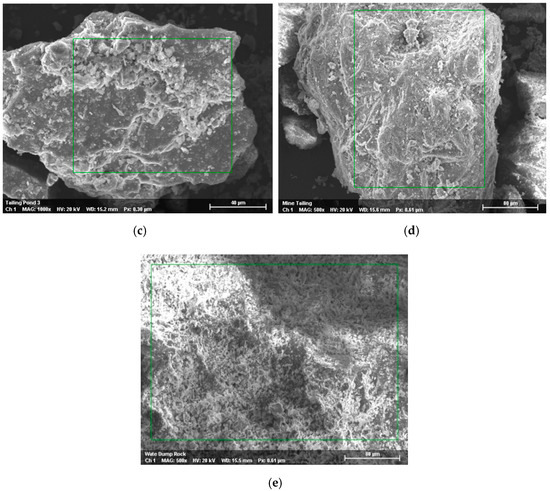 Scanning electron micrographs of samples (a) tailing pond 1; (b) tailing pond 2; (c) tailing pond 3; (d) mine tailing; and (e) waste dump.