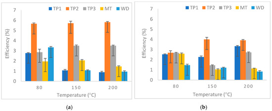 The effect of temperature on carbonation efficiency was investigated by applying variable reaction temperatures of 80 °C, 150 °C, and 200 °C, with constant particle size of 63 µm and a pH of 8.5. As with the effect of particle size, Fe carbonation efficiencies were noticeably higher than the Ca carbonation efficiencies (Figure 7a,b). The Fe carbonation efficiencies were ranging between 0.89–5.82% and 0.84–3.99%, respectively. However, the effects of varying the reaction temperatures were not directly seen. Despite this, for Ca carbonation efficiency, the effect of increasing the reaction temperature can be observed for the tailing pond samples (tailing pond 1, tailing pond 2, and tailing pond 3), i.e., higher carbonation efficiency occurs when the temperature was increased from 80 °C to 200 °C. For these tailing pond samples, the highest efficiencies were observed when the temperature was increased to between 150–200 °C. In contrast, the mine tailings and waste dump samples showed decreasing carbonation efficiency when the temperature was increased. It was also shown that the Fe carbonation efficiencies were noticeably higher for tailing pond 2 samples compared to other samples (Figure 7a). The effect of increasing temperature on Fe carbonation efficiency was observed for tailing pond 2 and tailing pond 3 samples when the temperature was increased from 80 °C to 200 °C. It can be seen that with a sufficient amount of iron oxides, the Fe carbonation efficiencies of these samples were increased to their highest rate at temperature of between 150–200 °C. Other samples showed a decreasing pattern of Fe carbonation efficiency as the temperature increased. This may happen as the increase in reaction temperature assists in the extraction of Fe and Ca from the samples as the reaction kinetic increases. As stated by Azdarpour et al. [19], there is always an optimum temperature in a direct aqueous carbonation which results in maximum carbonation efficiency, and this is influenced by the mineralogical and chemical composition of the samples. Despite the low carbonation efficiencies obtained, carbonate product can be successfully precipitated at an ambient pressure as applied in this experiment, although it is generally formed at elevated temperature [39]. As noted earlier, the carbonation efficiency of tailing pond 2 samples remains the highest due to the mineralogical and chemical composition of the sample.