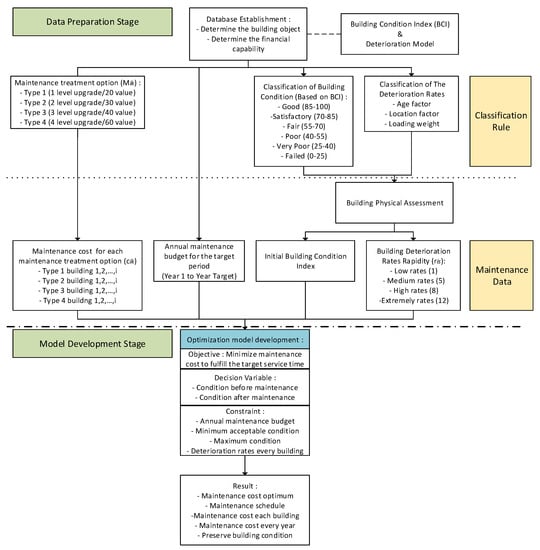 The research methodology of the proposed model is divided into two stages: (1) data preparation stage, (2) optimization model development stage. The experimental process of this study begins with the data collection of the selected school buildings. As a hard constraint of building maintenance problem, the assessment on annual budget approval from the responsible public sector must be also taken into consideration for the data preparation stage. The detailed definition of other necessary data for a good preventive management strategy, such as building condition index (BCI) value for each building and classification rules of deterioration rates, will be presented in the following subsections. Figure 1 illustrates the research flow of the proposed model for the building maintenance problem.