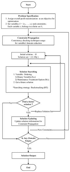 The propagation mechanism is implemented by the CP solution searching algorithm, by acquiring the objective function as a constraint while solving an optimization problem. The upper or lower bounds of the constraint are substituted after identifying a better objective function value. The solution searching process starts from the main objective, overall maintenance cost minimization, and related variables. The propagation constraints for reducing variable domains are obtained by using the consistency checking technique. Then, the variables and objects are stipulated as components of an empty set and treated as an initial solution. The BT searching strategy is used in this optimization algorithm to select relevant decision variables to promote search efficiency, then the key variables are searched in order with the following rules: (1) binary variable (Sijk) and (2) variable of maintenance treatment option (Mik), and the smallest value in each variable domain will become the starting point of the solution-searching process. Formerly the solution is an empty set, then, after acquiring a better value, this solution is substituted for the former solution. The current solution will be kept for a while when the present moves identify a worse solution up till when the next move engages in the case required. During each move, the solution information will be updated, and new constraints are then provided for constraint propagation and variable domain reduction. Furthermore, the solution re-searching and updating process is repeated for empty every variable domain. This process will quickly bind the optimal values from the variables’ domains, and the suggested optimization algorithm can acquire the optimal solution. [39]. The optimization algorithm is illustrated in Figure 2, thus an optimal solution for the objective can be assured.