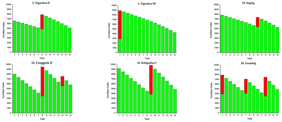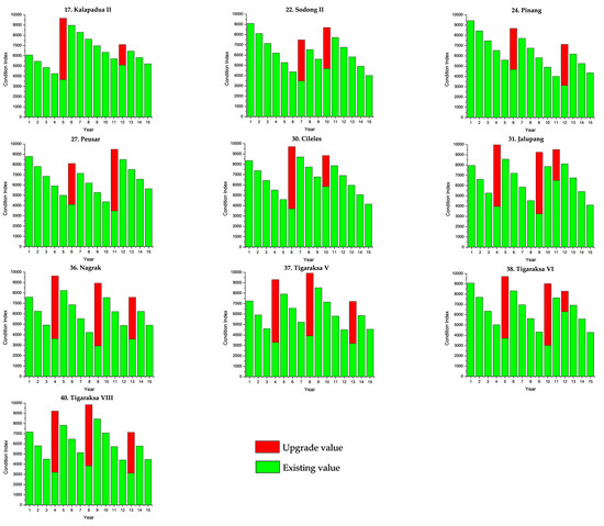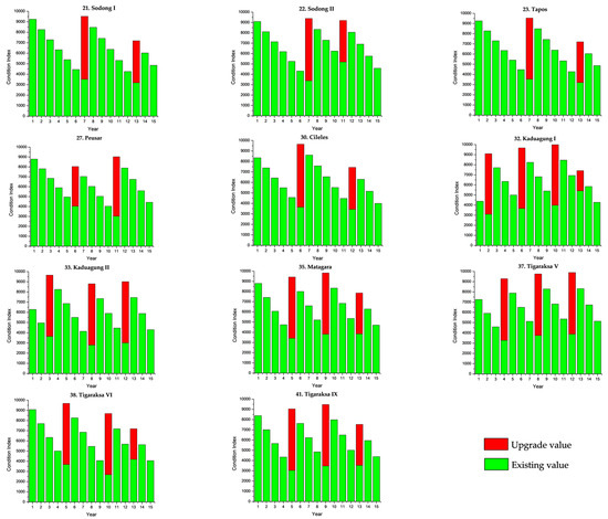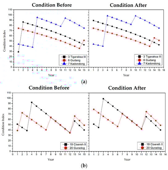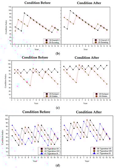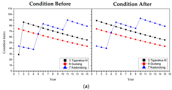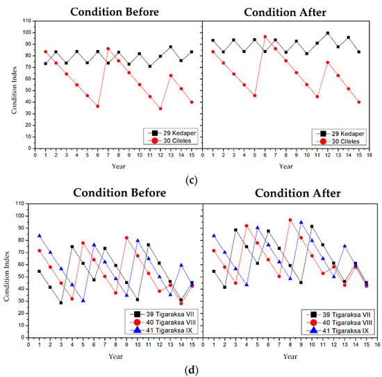 The deterioration rate in this scenario is based on a linear rate. The simulation of maintenance decision planning conforms with the model’s assumptions. Figure 3a–d compare the before and after maintenance conditions for the 10 sample buildings, selected according to the deterioration rates group for good priority condition, and specific conditions for building 7 in Figure 3a, as well as building 29 in Figure 3c.