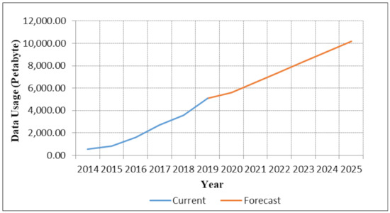 where is the Data Usage in Petabytes of the Telefonica and is the corresponding year of forecasting the Data Usage values. The known and estimated values of data usage by Telefonica can be seen in Figure 3. The estimated values have been calculated through Equation (3). Equation (4) shows the data usage prediction formula, and Figure 4 shows the current and predicted data usage by Telstra.