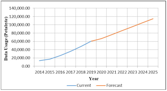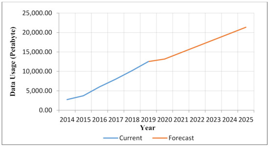 where is the Data Usage in Petabytes of the Vodafone and is the corresponding year of forecasting the Data Usage values. The values of and are determined through the regression analysis of known values. The predicted values from the year 2020 to 2025 are calculated using Equation (2). Figure 2 shows the known values used in regression analysis as Blue and predicted values as Red. The DU prediction equation for Telefonica is as follows;