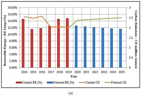 The forecasted values obtained from the equations can be seen in Figure 5, which shows the impact of renewable energy use over carbon emissions. Figure 5 shows that, despite the increase in total energy utilization, carbon emissions are expected to decrease with the increased renewable energy usage. From Figure 5a, it can be observed that the percentage of renewable energy usage in total energy requirements by Vodafone is expected to decrease. Vodafone has planned to do agreements with few firms to attain 100% of energy from renewable energy sources by 2025. However, no technical and quantitative details of these agreements are mentioned. Therefore, these prospected agreements cannot be included in forecasting.