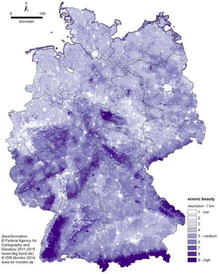 - Stein, C.; Walz, U. Indikator für ein Monitoring der landschaftlichen Attraktivität Deutschlands. In Flächeninanspruchnahme in Deutschland: Auf dem Wege zu Einem Besseren Verständnis der Siedlungs-und Verkehrsflächenentwicklung; Behnisch, M., Kretschmer, O., Meinel, G., Eds.; Springer Spektrum: Berlin, Germany, 2018; pp. 155–169. ISBN 9783662503041. [Google Scholar]