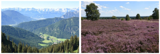 Landscapes with varieties in relief and uncommon sights like heathland belong to the most appreciated landscape photos in the online survey and lead to high levels in scenic beauty assessment (left: Alps near Oberammergau, Bavaria, right: Lueneburg Heath near Hermannsburg, Lower Saxony).