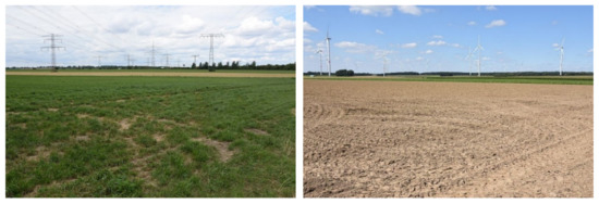 Unstructured agricultural landscapes often come with energy infrastructure like power lines and wind turbines and are not considered scenically beautiful (left: agricultural area with grid infrastructure near Magdeburg, Saxony-Anhalt, right: agricultural area with wind turbines near Hermannsburg, Lower Saxony).