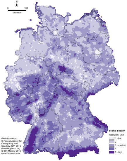 Resulting map for scenic beauty of Germany based on linear regression (resolution: 1 × 1 km) by Roth et al. [16].