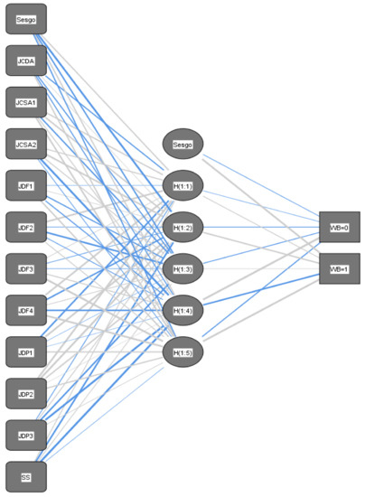 To assess the validity of the research hypothesis, two types of modeling were used: logit models and artificial neural networks. The endogenous variable to be analyzed is the well-being, which is transformed in a binary variable denoting an adequate level of well-being or the lack of it. It was specified as dependent on the three constructs JD, JC, and SS. The logit binary choice model [117,118,119] allows us to analyze the influence of causal exogenous variables on a binary endogenous variable. Subsequently, and in order to carry out the testing of the proposed hypotheses, the corresponding Z-tests were applied with positive results. Then, an artificial neural network is estimated to corroborate the effects of the three constructs introduced in the logit model, to forecast the well-being of the self-employed. Artificial neural networks (ANNs) are used in numerous classification problems, as with the binary variable representing the presence or absence of well-being. In the ANN, wellbeing (WB) constitutes the output layer, while the constructs are included in the input layer. There are some alternative multivariate techniques that could be applied: discriminant analysis or support vector machines. Finally, the coefficients obtained by both methods are evaluated in order to determine the priorities that each self-employed grants in the importance of their welfare situation.