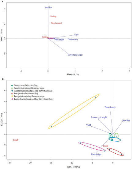 Redundancy analysis (RDA) showed (A) the influence of agronomic practice on lentil growth and (B) the impact of environmental factors on lentil growth. TotalT: temperature during whole growing season, TotalP: precipitation during whole growing season.