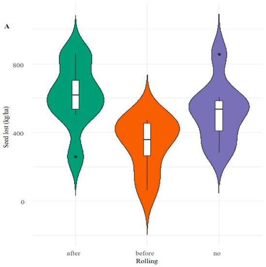 Rolling practice impacts on (A) seed lost at Scott 2017, and (B) plant density at Swift Current 2019. The different colored violin graphs use width to show data density for each treatment; the white box within each violin graph show the interquartile range of each dataset; the black bar in the middle of each box showed median number for each dataset; and the vertical black bar above and below the box show the 95% confidence interval of each dataset.