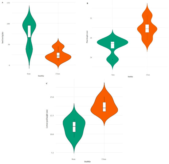 Stubble practice impacts on (A) seed lost at Scott 2017, (B) plant height at Scott 2018, and (C) lowest pod height at Swift Current 2018.