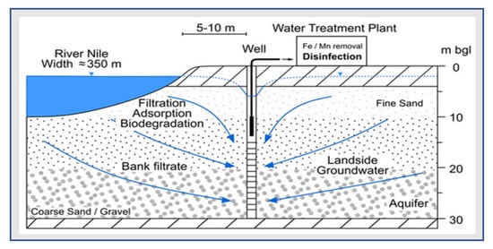 River Bank Filtration (RBF) is a water purification process in which river water is naturally filtered into the aquifer through the river bed or the banks of the river. A series of biological, chemical, and physical actions take place during the underground passage, which improve water quality [11]. Figure 1 presents a diagrammatic cross-section of the RBF system. It has been used in Europe for decades, especially since the end of World War II, because the rivers themselves have become significantly polluted with municipal and industrial effluents. Using RBF is now the most efficient method of producing high-quality drinking water. It is worth mentioning that earlier, in the 1870s, it was used in Germany, along the Rhine, Elbe and Danube, and in France along the Seine, to provide drinking water to cities [12]. Recently, many countries around the world have started evaluating RBF potential for water treatment, including countries like India, Jordan, and China [13,14,15]. Egypt has started using the RBF technique in water treatment processes as a primary or complete treatment step. The Holding Company for Water and Wastewater (HWCC) has conducted field investigations to study the efficiency of this system and it has shown satisfying results [16], especially at times when conventional water supply stations are liable to closure because of surface water pollution as a result of natural conditions such as floods, or leaks from ships and fuel carriers.