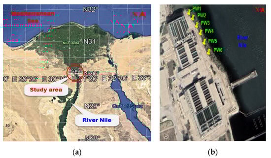 The study area is located in Giza Governorate, Egypt between latitudes 30° 06\ to 30° 07\ N and longitudes 31° 12\ to 31° 13\ E, occupying about 4 km2, as presented in Figure 2a. This is the location of the drinking water and sewage plant at Embaba, which operates for a population of more than 8 million [22].